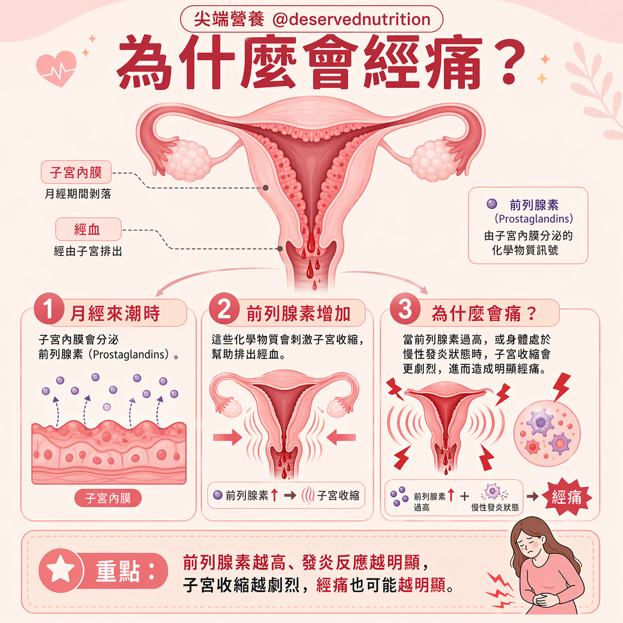 月經期間,子宮內膜會分泌前列腺素 (Prostaglandins),這類化學物質會引發子宮收縮以排出經血。當前列腺素水平過高,或是身體處於慢性發炎狀態時,劇烈的收縮就會導致難耐的經痛。