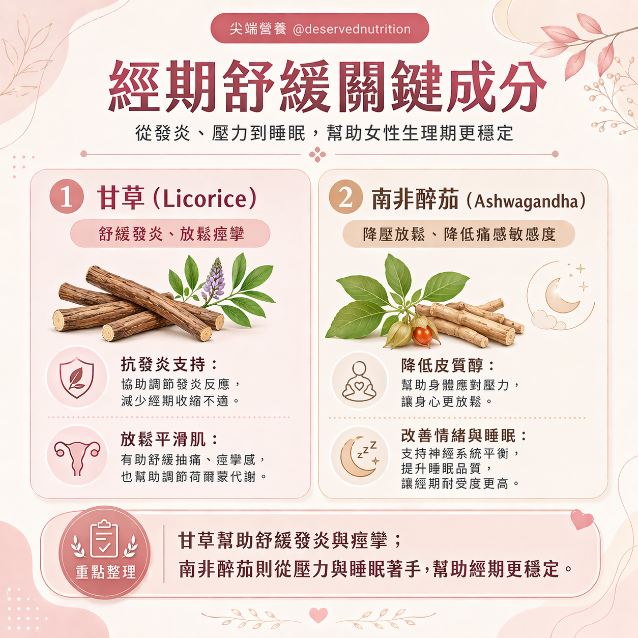 ※ 免責聲明:本文僅供衛教分享。若有巧克力囊腫、子宮肌瘤或懷孕期間,補充甘草與南非醉茄前請務必諮詢主治醫師。