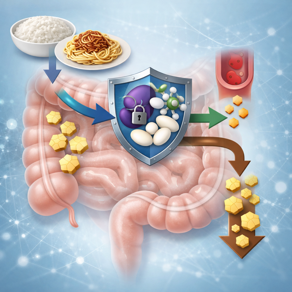 當我們吃下碳水化合物時,唾液與胰臟會分泌α-澱粉酶來分解澱粉。Alpha-AI 的作用就是去「鎖住」這些酶,讓澱粉無法被完全分解成小分子的糖。既然不能被分解,小腸就無法吸收這些熱量,最後會直接排出體外。